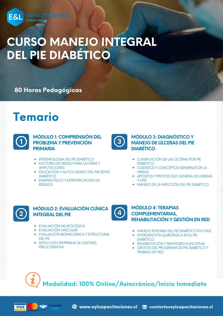 En este Curso podrás desarrollar las competencias necesarias para prevenir, evaluar y manejar de manera integral el pie diabético, comprendiendo sus factores de riesgo, aplicando una evaluación clínica sistemática y ejecutando estrategias terapéuticas oportunas para disminuir complicaciones y amputaciones. A lo largo del programa fortalecerás tu capacidad de intervención clínica, rehabilitación y trabajo coordinado en la red de salud, contribuyendo a una atención segura, basada en evidencia y centrada en el paciente.